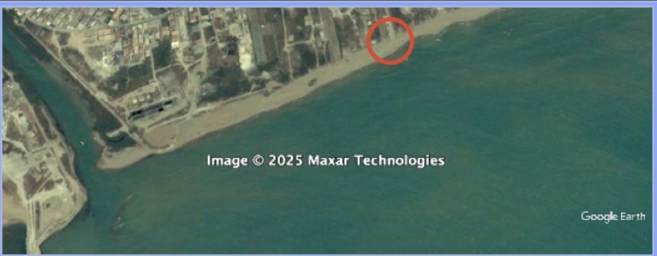 Google Earth 5/2005, la linea di riva appare stabile e la casa crollata, nel cerchietto, nel marzo 2026 era a più di 300 m dalla linea di riva.