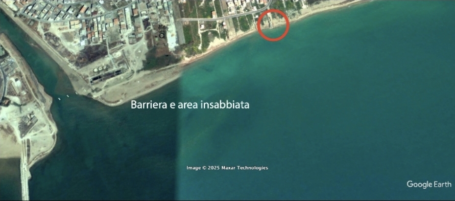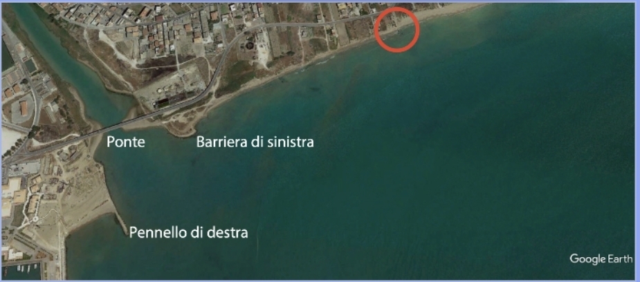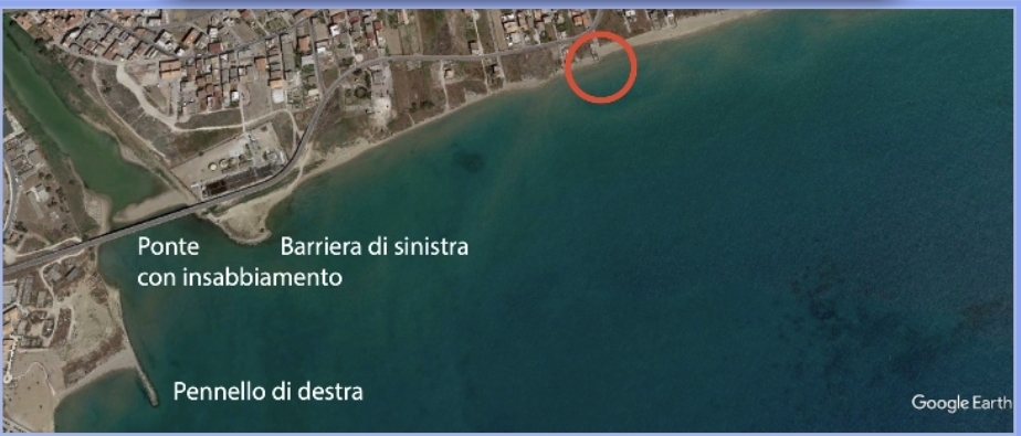 Google Earth 4/2010, viene realizzata una barriera di forma oscena alla foce del fiume Salso, in sinistra idrografica, provocando un insabbiamento nell’area immediatamente protetta e innescando un processo erosivo sottoflutto, tanto che la palazzina crollata l’altro giorno, che era a 300 m dalla linea di riva 5 anni prima, dopo la realizzazione di quest’opera si trova con l’acqua sotto la veranda.