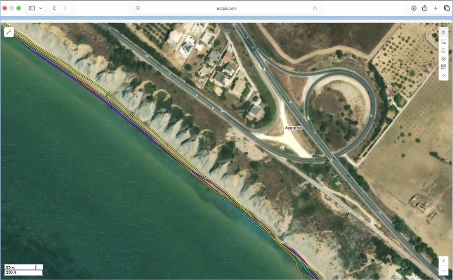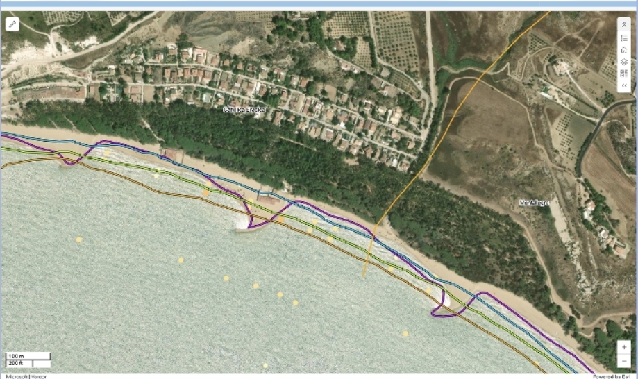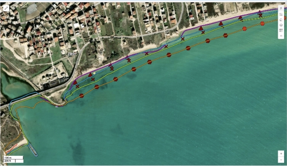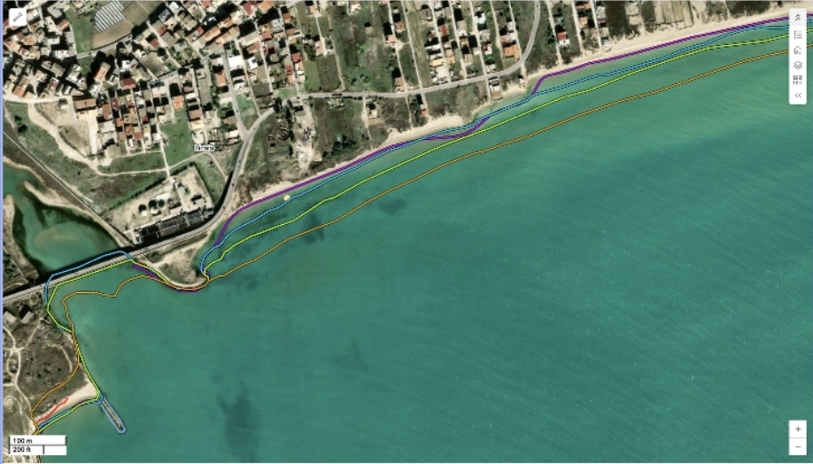 Evoluzione diacronica della linea di riva: in arancione la linea di riva del 2008, in verde quella del 2012, in azzurro quella del 2019 e in viola quella del 2024, derivata da un’immagine satellitare (le altre tre linee di riva sono state estratte da altrettante ortofoto regionali). Interessante anche l’evoluzione della foce del fiume Salso che risulta essere progressivamente più approfondita e l’evoluzione opposta dovuta alla costruzione del pennello in destra idrografica.